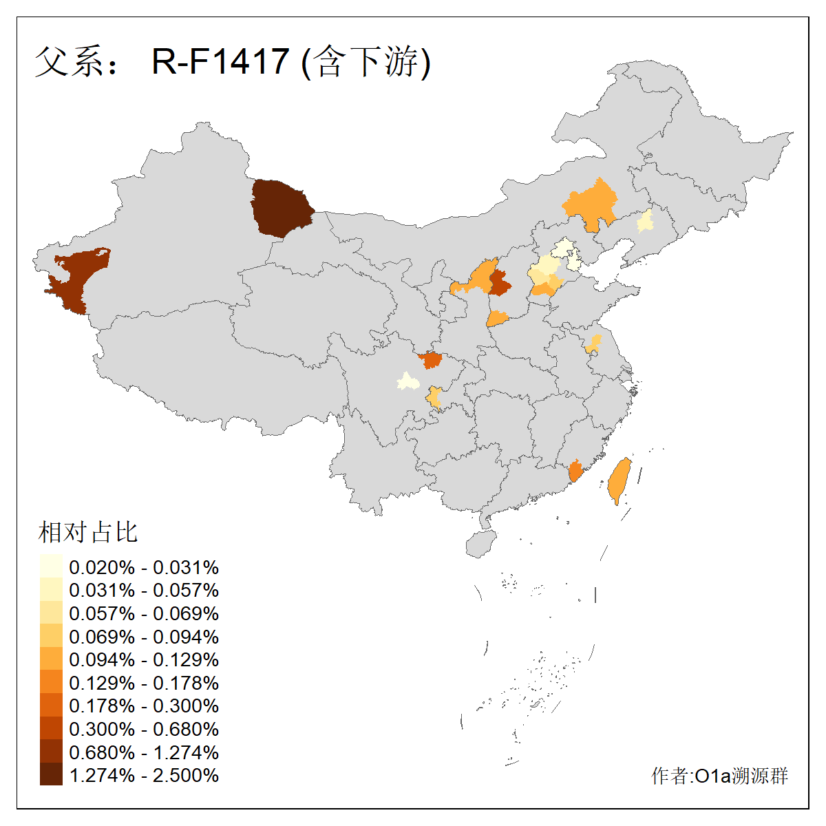 | R_R-Y482_R1_R-M343_R-L754_R-L761_R-L389_R-P297_R-M269_R-L23_R-L51_R-P310_R-L151_R-M405_R-S263 | 3940 | 0.009% | 21人(含下游) 杨:3 倪:1 吴:1 羊:1 老:1 郭:1 钟:1 雷:1 高:1 ![]() | 1人(不含下游)![]() |