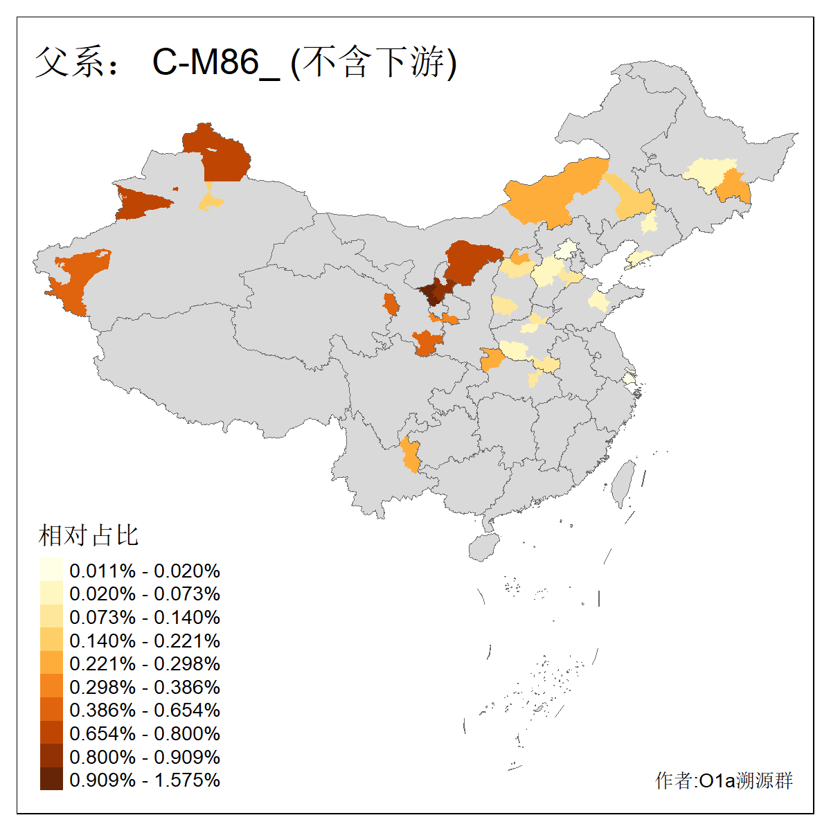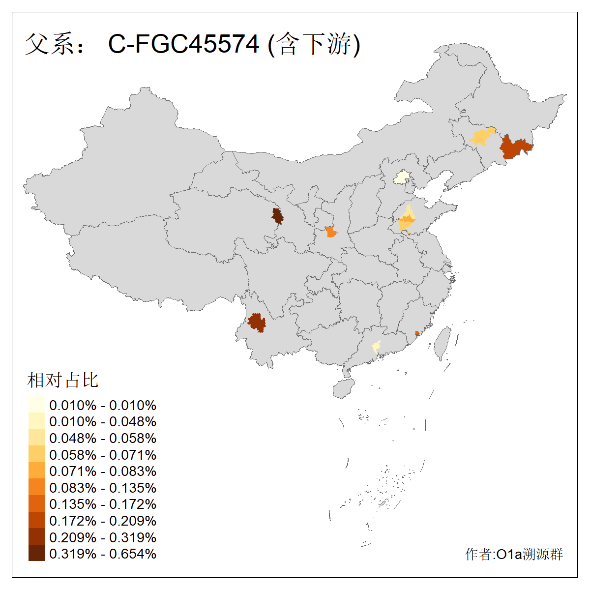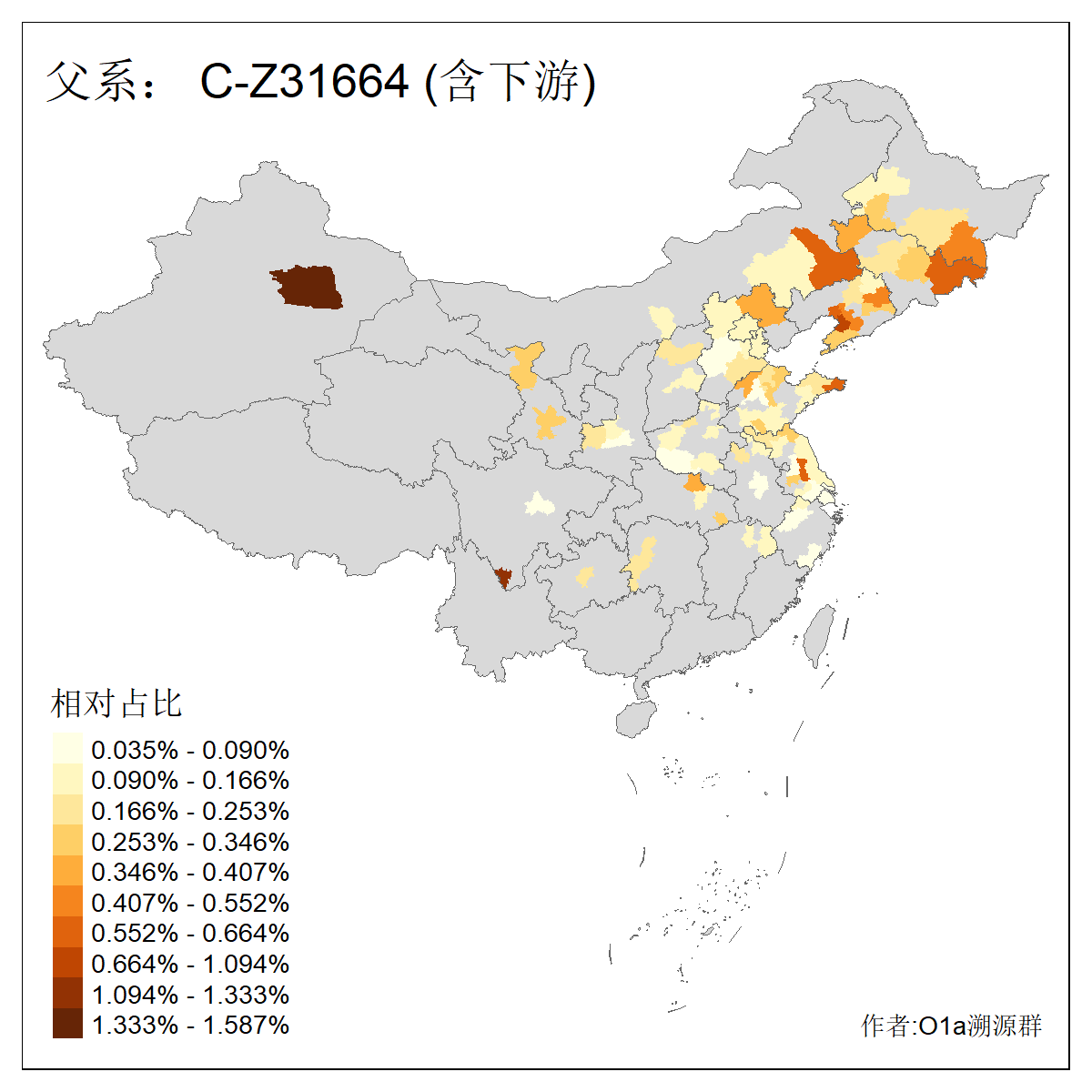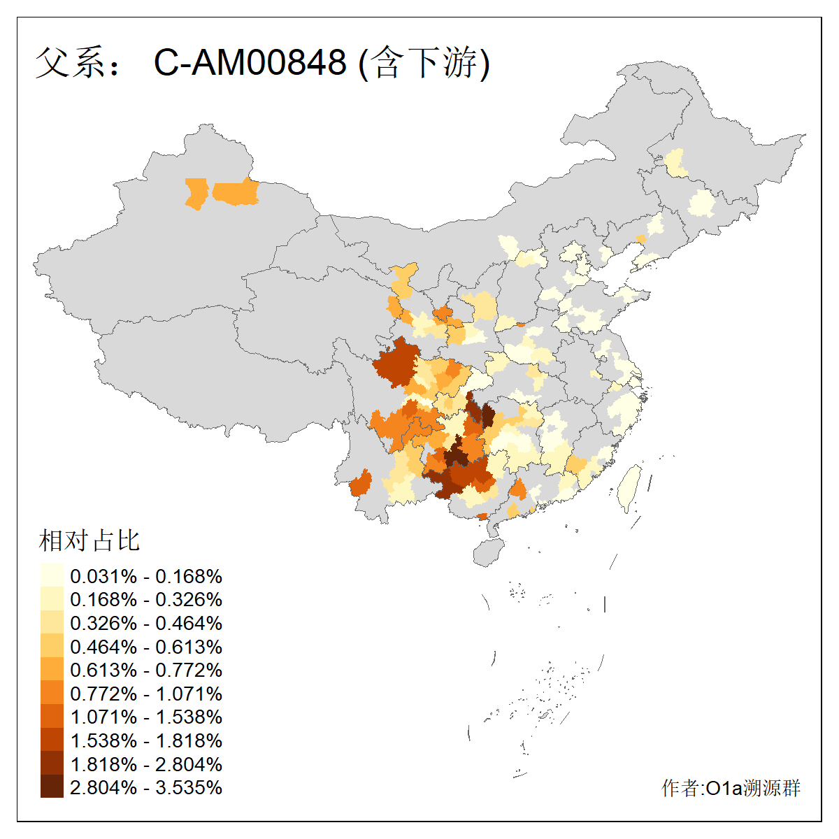 | C-M130_C-M217_C-L1373_C-F3447_C-F1699_C-Y6715_C-M504 | 8600 | 0.337% | 730人(含下游) 赵:47 李:36 张:34 关:29 王:26 吴:20 马:17 阿:16 刘:14 白:14 艾:14 何:13 巴:12 哈:11 ![]() | 10人(不含下游) 赵:3 张:1 洪:1 祖:1 肖:1 鄂:1 马:1 ![]() |