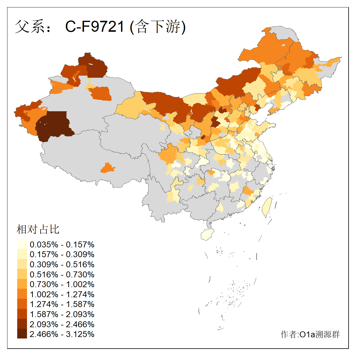 | C-M130_C-M217_C-L1373_C-F3447_C-F1699_C-Y6715_C-Y10418_C-FGC28903_C-F1756_C-F12632_C-Y10417_C-F3830_C-F10085_C-F9721 | 3620 | 0.325% | 719人(含下游) 刘:68 王:63 张:51 李:46 赵:24 关:20 杨:19 马:14 白:13 高:13 孙:12 田:12 陈:11 吴:9 ![]() | 214人(不含下游) 刘:28 张:18 王:16 李:14 杨:7 侯:5 孙:5 陈:5 徐:4 田:4 白:4 赵:4 高:4 乔:3 ![]() |
